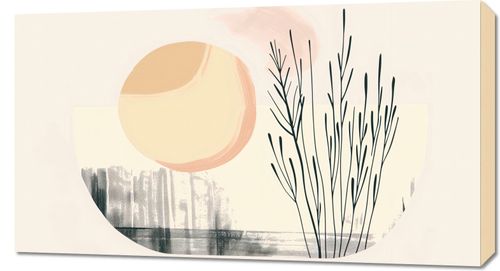 Obraz z serii boho zatytułowany Pastelowy Wschód. Obraz ukazuje subtelny, linearny rysunek roślinności na tle dużego, pastelowego słońca i delikatnie zaznaczonych elementów krajobrazu. Kompozycja w pastelowych, ciepłych barwach tworzy wrażenie spokojnego wschodu słońca, który rozświetla delikatne kontury roślin i miękkie formy w tle. Obraz ten idealnie wpasuje się do wnętrz o stonowanej kolorystyce, gdzie może dodać odrobinę ciepła i subtelnego charakteru. Doskonale nadaje się do sypialni, salonów, czy innych miejsc odpoczynku, gdzie wprowadzi łagodny nastrój i poczucie wyciszenia.