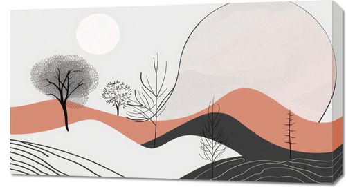 Obraz z serii boho zatytułowany Półcień Widoku.Obraz przedstawia oniryczny pejzaż, gdzie delikatne linie drzew przenikają przez łagodne, faliste wzgórza. Ciepłe odcienie czerwieni i różu przeplatają się z chłodniejszymi szarościami i czernią, tworząc poczucie głębi i spokoju. Subtelna tekstura na niektórych elementach dodaje wrażenia ruchu, a biała sfera w tle przywołuje skojarzenia z pełnią księżyca lub wschodzącym słońcem. Dzieło idealnie wpasuje się w wnętrza o spokojnym charakterze, takie jak stylowe sypialnie, czytelnie lub pokoje relaksacyjne. Może również przynieść element ukojenia i inspiracji do przestrzeni współpracujących, zapewniając wizualną odskocznię od codzienności. Zapewni miękki kontrast we wnętrzach urządzonych w naturalnych materiałach i odcieniach.