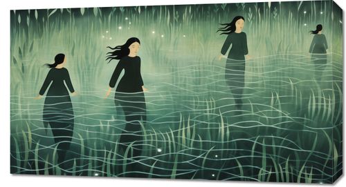 Obraz z serii wnętrza zatytułowany Pośród Ciszy, przedstawia grupę postaci kobiecych, poruszających się z gracją przez mglisty, oniryczny krajobraz. Zanurzone po kolana w wodzie, otoczone przez zielone, eteryczne trawy i dyskretnie świecące światła, postacie emanują spokojem i tajemniczością. Styl obrazu, z jego płynnymi liniami i spokojnymi odcieniami zieleni, tworzy uczucie medytacyjnej głębi i harmonii z naturą. Ten obraz idealnie nadaje się do wnętrz, które pragną odzwierciedlić głęboką spokojność i introspekcję, takich jak pokoje medytacyjne, strefy relaksu, domowe biblioteki, a także jako subtelny akcent w przestrzeniach publicznych, gdzie zachęca do chwili wytchnienia i refleksji.
