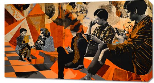 Obraz z serii pop art zatytułowany Przestrzeń Do Dialogu. Prezentuje grupę ludzi w stylizowanych retro ubraniach, zanurzonych w konwersacji i zatopionych w swoich myślach, co sugeruje głębię ludzkiego połączenia i introspekcji. Tło plakatu to geometryczne i abstrakcyjne formy w odcieniach pomarańczu, żółci i brązu, nawiązujące do lat 60. i 70. XX wieku, wprowadzając elementy vintage do nowoczesnej przestrzeni. Postacie wydają się pochłonięte rozmową, a ich pozy i gesty odzwierciedlają osobistą wymianę i komunikację. Obraz ten jest idealny do kawiarni, salonów, bibliotek, lub jako inspirujący akcent w domowych biurach, zachęcając do refleksji i twórczego dialogu.