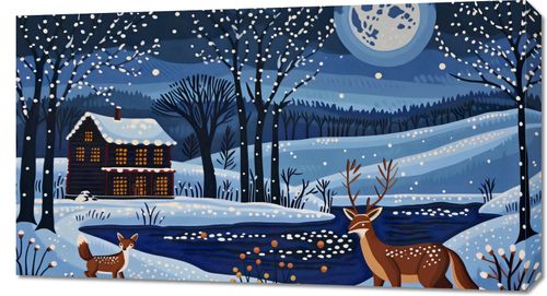 Obraz z serii abstrakcja zatytułowany Przyszła Zima. Obraz przedstawia malowniczą, zimową scenę w stylistyce folklorystycznej. Na obrazie dominują chłodne odcienie niebieskiego, tworząc nocny krajobraz pokryty śniegiem. Centralny motyw stanowi dom z oświetlonymi oknami, co nadaje scenie ciepły, przytulny akcent. Śnieg delikatnie opada na drzewa i dach domu, a pełnia księżyca rozświetla niebo, odbijając się w zamarzniętym strumieniu. Na pierwszym planie widać sylwetki zwierząt: dorosłego jelenia i młodego lisa, które dodają kompozycji naturalnego życia i ruchu. Tło przedstawia malownicze wzgórza i lasy, co współgra z idyllicznym, spokojnym nastrojem obrazu. Scena ta wywołuje uczucie spokoju i cichej radości, sprawiając, że plakat ten jest idealny do dekoracji wnętrz w zimowym okresie, dodając im ciepła i uroku.