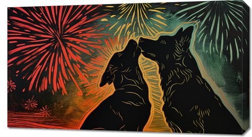 Obraz z serii abstrakcja zatytułowany Psi Uścisk. Przedstawia on dwie sylwetki psów, które wydają się być zwrócone ku sobie w gest podobny do uścisku, na tle intensywnie kolorowego nieba z fajerwerkami. Barwy od czerwieni po żółcie i zielenie tworzą tło, które wygląda jak nocne niebo w trakcie świętowania. Styl graficzny jest dynamiczny i pełen energii, a linie tworzące sylwetki psów są płynne i wyraziste. Ten obraz wyraża radość i nieodłączną więź pomiędzy zwierzętami, będąc doskonałym dodatkiem do wnętrz, gdzie chcemy podkreślić ciepło i pozytywne emocje.