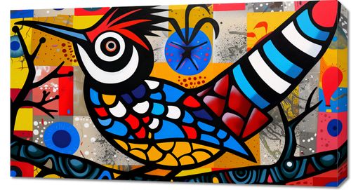 Obraz z serii abstrakcja zatytułowany Ptak Na Wznak. Obraz przedstawia kolorową, dynamiczną ilustrację ptaka w stylu współczesnego, miejskiego graffiti. Ptak ma wyraziste, żarówiasto czerwone, niebieskie i żółte pióra, a jego ciało jest wypełnione wzorami i kształtami, które tworzą wrażenie ruchu i życia. Oczy ptaka są przerysowane, z dużym, hipnotyzującym okiem, które przyciąga uwagę i dodaje charakteru ilustracji. Tło obrazu jest kolażem złożonym z różnorodnych kształtów i tekstur, w tym kropek, linii i abstrakcyjnych form, w paletcie kolorów od jasnych żółci i czerwieni po głębokie błękity i czernie, co nadaje dziełu złożony i dynamiczny charakter. Ten obraz może być interpretowany jako hołd dla street artu, łączący tradycyjną ikonografię ptaka z nowoczesnymi elementami sztuki miejskiej. Idealnie nadawałby się jako dekoracja do nowoczesnych przestrzeni, wprowadzając energię i kreatywność do każdego wnętrza.