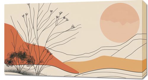 Obraz z serii boho zatytułowany Pustynna Wydma. Obraz ukazuje krajobraz z delikatnie zarysowanymi roślinami na tle łagodnych, pustynnych wydm. Spokojna kolorystyka, opierająca się na miękkich odcieniach beżu, pomarańczy i czerwieni, oddaje kojący klimat zmierzchu. W tle widoczne jest wielkie, ciepłe słońce, które rzuca złoty blask na całą scenę, nadając jej harmonijny charakter. Ten obraz będzie piękną dekoracją do wnętrz, które pragną wprowadzić elementy natury w połączeniu z minimalistycznym designem. Jego uspokajające barwy i proste linie idealnie wpasują się w przestrzenie takie jak sypialnie, salony, miejsca odpoczynku, czy nawet biura kreatywne, pragnące wykreować przestrzeń sprzyjającą relaksowi i inspiracji.