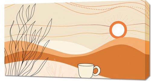 Obraz z serii minimalistyczne zatytułowany Ranna Pora. Obraz przedstawia stylizowany, spokojny krajobraz pustynny z wschodzącym słońcem, które emanuje ciepłem, barwiąc niebo w pastelowe odcienie. Ponad łagodnymi, falującymi wzgórzami widnieją delikatne linie, które mogą przypominać ciepłe prądy powietrza lub subtelne ozdoby. Na pierwszym planie znajduje się filiżanka kawy, umieszczona tak, jakby była częścią pustynnego terenu, co dodaje scenie element codziennego rytuału i spokoju. Obraz jest pełen ciepłych, ziemiście beżowych i pomarańczowych odcieni, które wprowadzają atmosferę relaksu i spokoju. Idealnie pasuje do przestrzeni wypoczynkowych, takich jak kawiarnie, salony, czy pokoje do odpoczynku, gdzie może pomóc stworzyć przytulne i spokojne otoczenie. Dzieło to z pewnością będzie przyciągać wzrok, będąc subtelny jednocześnie.