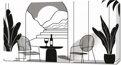 Obraz z serii minimalistyczne zatytułowany Relaks w Monochromie. Obraz przedstawia stylizowaną, monochromatyczną scenerię wnętrza wypoczynkowego, w którym dominuje spokój i prostota. Czarno-białe rośliny dodają życia eleganckiemu, geometrycznemu przestrzeni, a finezyjnie zaprojektowane meble tworzą atmosferę luksusu i komfortu. Na pierwszym planie widoczny jest okrągły stolik z butelką wina i dwoma kieliszkami, sugerujący chwilę relaksu lub intymnego spotkania. Tło stanowi wielki, abstrakcyjny obraz, który może przypominać ułożone w rzędy fale morskie lub schody prowadzące ku nieznanemu. Obraz ten jest doskonały do nowoczesnych mieszkań i miejsc użyteczności publicznej, gdzie dominuje współczesny design i minimalistyczne podejście do dekoracji. Jego prostota i elegancja doskonale odnajdą się w przestronnych salonach, stylowych lobby hotelowych lub modnych przestrzeniach lounge.