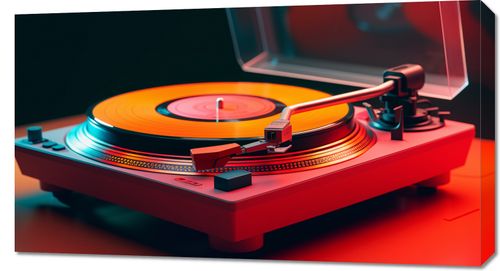 Obraz z serii pop art zatytułowany Retro Granie. Ta ilustracja ukazuje klasyczny gramofon w intensywnych kolorach, z winylową płytą obracającą się na talerzu. Ciepłe odcienie czerwieni i pomarańczy gramofonu kontrastują z chłodnymi, neonowymi akcentami w tle, tworząc nowoczesny, a jednocześnie nostalgicznym klimat. Obraz oddaje hołd złotej erze muzyki winylowej i jest idealnym elementem dekoracyjnym dla miłośników muzyki, dodającym charakteru każdemu wnętrzu, od salonów po muzyczne kąciki czy studia nagrań.
