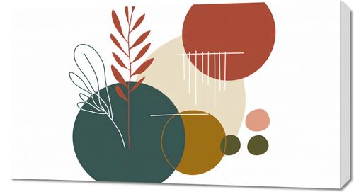 Obraz z serii minimalistyczne zatytułowany Rytm Warkotu. Ta grafika przedstawia stylizowane rośliny w ciepłych odcieniach czerwieni i zieleni, kontrastujące z geometrycznymi kształtami kół w spokojnych barwach beżu, żółci i głębokiej zieleni. Linie pionowe, wydające się być jak deszcz, dodają dynamiki i lekkości kompozycji.Ten obraz będzie się pięknie prezentować w przestrzeniach, które celebrują spokój i naturę. Doskonale wpasuje się w estetykę zen, ekologicznych wnętrz, czy w każdym pomieszczeniu, które ma na celu wprowadzenie elementów natury do domowego otoczenia. Będzie to świetny wybór dla tych, którzy szukają dekoracji ściennych do jasnych, przestronnych pomieszczeń, takich jak salony, jadalnie czy przestrzenie do medytacji.