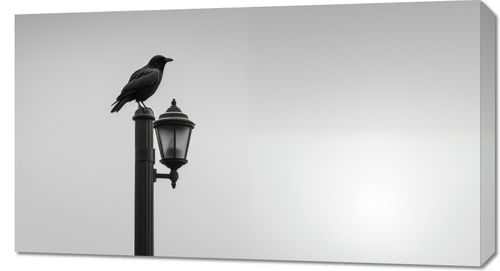 Obraz z serii wnętrza zatytułowany Samotny Postój Kruka. Prezentuje on sylwetkę kruka spoczywającego na klasycznej latarni ulicznej, uchwyconą w monochromatycznej palecie szarości. Ten spokojny, lecz sugestywny obraz jest symbolem refleksji i tajemnicy, doskonale wpisując się w klimat współczesnych przestrzeni miejskich. Praca ta z pewnością stanie się wyrazistym dodatkiem do nowoczesnych wnętrz, takich jak lofty czy minimalistyczne salony, a także wniesie element zastanowienia do przestrzeni publicznych takich jak galerie, kawiarnie i biblioteki, gdzie odosobnienie miesza się z miejskim zgiełkiem.