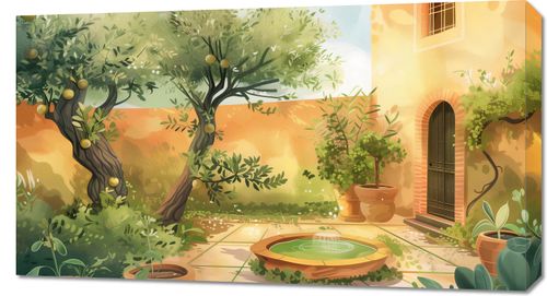 Obraz z serii abstrakcja zatytułowany Słoneczny Dzień. Obraz ukazuje idylliczny ogród w ciepły, słoneczny dzień. Widoczna jest część kamiennego patio otoczonego bujną roślinnością, z dojrzałymi cytrynami wiszącymi na gałęziach niewielkich drzew. W centrum kompozycji znajduje się dekoracyjny kamienny basen z delikatnym strumieniem wody. Na pierwszym planie widać donice z różnorodnymi roślinami, które dodają scenie domowego ciepła. Jaskrawość słońca jest złagodzona przez liście drzew, tworząc wzorzyste cienie na płytach chodnika. Architektura w tle, z żółtymi ścianami i ciemnymi drewnianymi drzwiami, współgra z naturalną paletą kolorów ogrodu. Atmosfera obrazu jest spokojna i relaksująca, sugerująca miejsce ucieczki i odpoczynku.