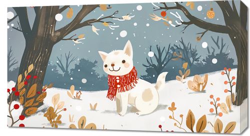 Obraz z serii wnętrza zatytułowany Śnieżny Kompan. Urocze przedstawienie białego, puchatego psa w czerwonym szaliku, który przywołuje ciepłe uczucia w chłodnym, zimowym otoczeniu. Zwierzę z radosnym wyrazem twarzy wydaje się cieszyć spadającymi płatkami śniegu, co dodaje obrazowi poczucia radości i bezpretensjonalnej zabawy. Tło w pastelowych odcieniach bieli i szarości z delikatnymi akcentami kolorystycznymi tworzy spokojną i relaksującą atmosferę. Obraz idealnie nadaje się do dekoracji pomieszczeń dziecięcych, salonów, czy przytulnych kawiarni, wprowadzając do wnętrza element zabawy i niewinności. Jego ciepłe barwy i sympatyczny motyw sprawią, że będzie doskonałym dodatkiem do miejsc, w których chcemy poczuć odrobinę zimowego ciepła i uroku.