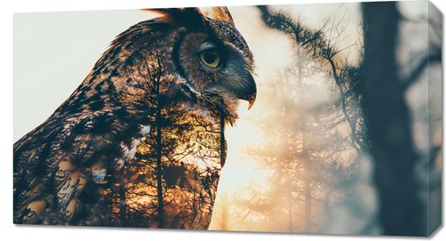 Obraz z serii natura zatytułowany Sowi Duch. Prezentuje on majestatyczną sylwetkę sowy zlewaną z tłem o zachodzie słońca w lesie, co podkreśla jej dziką naturę i instynktowną mądrość. Ciepłe odcienie zachodzącego słońca i sylwetki drzew przenikają się z delikatnym konturem sowy, tworząc wrażenie jedności z naturą. Obraz ten idealnie wpasuje się w przestrzenie takie jak gabinet, biblioteka lub salon, gdzie może inspirować do refleksji i spokoju, przypominając o głębokich, nieodkrytych aspektach natury.