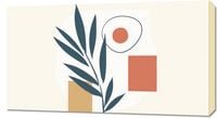 Obraz z serii boho zatytułowany Splot Natury.Obraz to subtelne połączenie abstrakcyjnych form i motywów przyrodniczych. Ciepłe, stonowane kolory tworzą delikatne tło dla wyrazistych, ciemnozielonych liści. Geometryczne kształty, w tym okrąg z centralnie umieszczonym punktem, przypominają stylizowane oko, które wraz z prostokątem w ciepłym kolorze tworzy kompozycję pełną spokoju i równowagi.To dzieło doskonale wpasuje się w przestrzenie, które łączą współczesny design z elementami naturalnymi, takie jak jasne salony, przestronne studia, czy strefy relaksu w domach i miejscach publicznych. Prosta paleta kolorów i elementy roślinne mogą wprowadzić wyciszającą atmosferę do sypialni lub gabinetów, gdzie design współgra z funkcją i tworzy przestrzeń do odprężenia i inspiracji.
