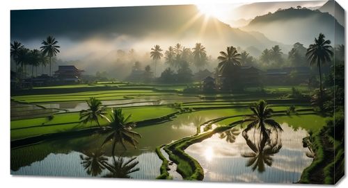 Obraz z serii pejzaże zatytułowany Świt nad Tarasami. Ta zachwycająca scena przedstawia malownicze tarasy ryżowe, kąpane w ciepłym świetle wschodzącego słońca. Mgła delikatnie opada na zielone pola, a w tle majaczą zarysy gór, dodając głębi i tajemniczości krajobrazowi. Palmy i tradycyjne chaty dopełniają obrazu, tworząc wizję spokoju i harmonii z naturą. Obraz emanuje spokojem i jest hołdem dla prostoty wiejskiego życia. Idealnie wkomponuje się w przestrzenie, gdzie chcemy wprowadzić element uspokajający i zainspirowany naturą, jak medytacyjne spa, poczekalnie w klinikach wellness czy prywatne biblioteki.