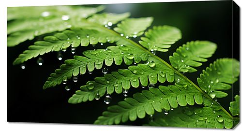Obraz z serii natura zatytułowany Szepty Natury, prezentuje zbliżenie na liść paproci okryty kropelkami rosy, które lśnią jak drogocenne klejnoty na jego witalnie zielonej powierzchni. Delikatność każdej kropli wody, zawieszonej jakby na skraju czasu, oddaje spokój i harmonię natury, jednocześnie przywołując uczucie świeżości i ożywienia. Tło obrazu jest głębokie i jednolite, co pozwala zaakcentować jasne zieleń liści i przezroczystość wody. Ten obraz może być symbolem czystości i nowych początków, idealnie wkomponuje się w przestrzenie skoncentrowane na zdrowiu i dobrostanie, takie jak gabinety lekarskie, spa, czy też jako element dekoracyjny w łazienkach i pomieszczeniach relaksacyjnych, przynosząc uczucie spokoju i odświeżenia.