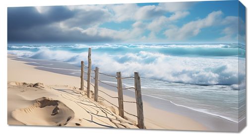 Obraz z serii pejzaże zatytułowany Szepty Oceanu przedstawia dziką, nieokiełznaną siłę natury, uchwyconą w potężnych, spienionych falach oceanu bijących o brzeg. Stare, drewniane słupki, połączone powykręcanym sznurem, dodają kompozycji surowego charakteru i poczucia trwałości w obliczu nieskończonej przestrzeni wody. Piasek, modelowany przez wiatr, tworzy delikatne wzory, które kontrastują z mocy i wielkości oceanu. Ten obraz jest kwintesencją siły i spokoju, idealny do przestrzeni współczesnych, minimalistycznych lub tych o morskim motywie, gdzie może inspirować do refleksji nad nieustającą zmiennością i majestatem natury.