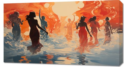 Obraz z serii wnętrza zatytułowany Taneczny Żar, przedstawia grupę osób tańczących w rytmicznych ruchach w wodzie, z tłem zapalającego się nieba w odcieniach ciepłego pomarańczu i czerwieni. Postacie są przedstawione w dynamicznych pozach, z włosami rozwianymi przez wiatr, co nadaje obrazowi wrażenie ruchu i pasji. Styl obrazu, z jego płynnymi liniami i żywymi kolorami, tworzy uczucie energii i życia. Ten obraz idealnie nadaje się do wnętrz, które chcą uchwycić esencję ruchu, radości i wolności, takich jak studia taneczne, kreatywne przestrzenie pracy, a także jako inspirujący element w domach, gdzie może stanowić przypomnienie o pięknie wspólnych chwil i celebracji życia.