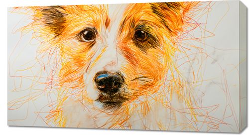 Obraz z serii wnętrza zatytułowany Uroczy Gość przedstawia twarz uroczego psa, stworzoną z setek dynamicznych, kolorowych linii. Jego oczy pełne są życia, a ciepła paleta barw, od żółtego po czerwony, nadaje temu dziełu szczególnego ciepła i energii. Szkicowe kreski nie tylko oddają fakturę futra, ale także wibrującą osobowość psa. Ten obraz idealnie sprawdzi się jako uroczy, artystyczny akcent w przestrzeniach takich jak kawiarnie, kliniki weterynaryjne lub domy miłośników zwierząt, dodając im serdeczności i oryginalności.