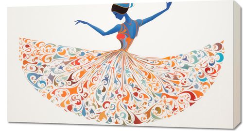 Obraz z serii abstrakcja zatytułowany Wirująca Balerina. Obraz przedstawia tancerkę w barwnym, rozłożystym stroju, który tworzy efekt wirującej sukni. Tancerka jest przedstawiona w dynamicznej pozie tanecznej, z rękami delikatnie uniesionymi. Suknia jest zdobiona bogatym, ornamentowym wzorem w ciepłych odcieniach pomarańczy, czerwieni, niebieskiego i kremu, które nadają jej lekkości i elegancji. Stylizacja postaci i wzory na sukni mogą nawiązywać do tradycyjnych strojów tanecznych lub folklorystycznych, a cała kompozycja przypomina sztukę w stylu Art Nouveau. Obraz ten wprowadza atmosferę radości i świętowania, doskonale nadając się do przestrzeni kulturalnych, sal tanecznych, teatrów lub jako wyrafinowana dekoracja w domowych wnętrzach.