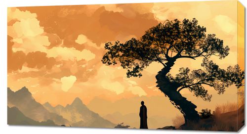Obraz z serii motywy wschodnie zatytułowany Zen. Obraz przedstawia malowniczy krajobraz w ciepłych odcieniach pomarańczy i brązu, sugerujący scenerię o zachodzie słońca. Centralny punkt obrazu to sylwetka krętego drzewa z gęstym, czarnym liśćmi, wyróżniającego się na tle zachmurzonego nieba. U jego podnóża stoi samotna postać ludzka, która wydaje się rozważać lub podziwiać otaczający ją pejzaż. W oddali majaczą zarysy górskie, co dodaje głębi i tajemniczości kompozycji. Całość tworzy atmosferę spokoju, refleksji i połączenia z naturą. Świetnie sprawdzi się w pomieszczeniach o tematyce orientalnej jak i salonach psychologicznych.