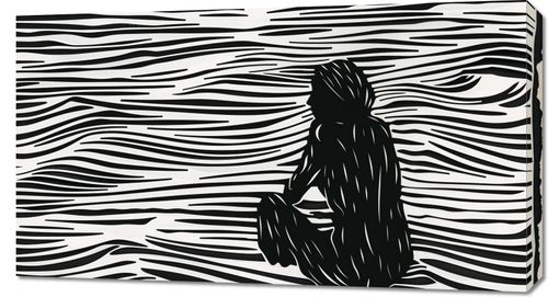 Obraz z serii abstrakcja zatytułowany Złożone Fluidalne Linie. Plakat przedstawia abstrakcyjną, czarno-białą ilustrację, w której kontrastowe, fluidalne linie tworzą efekt wzburzonej powierzchni wody. Na tej dynamicznie zarysowanej powierzchni wyłania się sylwetka osoby, która siedzi w skupieniu, z głową zwróconą w stronę obserwatora. Postać jest zredukowana do ciemnych, monochromatycznych bloków, co nadaje jej minimalistyczny, ale wyrazisty charakter. Sylwetka człowieka jest wyraźnie zarysowana i stanowi centralny punkt kompozycji, a jej kontury płynnie wtapiają się w abstrakcyjne tło. Ten artystyczny obraz łączy prostotę z głębią, sugerując kontemplację lub introspekcję. Jego prosta paleta barw i silne linie mogą przyciągać uwagę i inspirować do refleksji nad spokojem i złożonością ludzkiej natury.