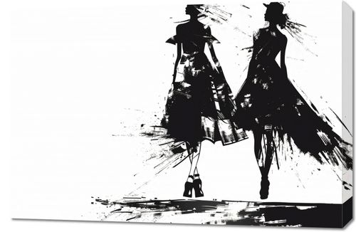 Obraz z serii wnętrza zatytułowany Atramentowy Przerys. Plakat ukazuje dwie stylizowane postacie kobiet w dynamicznej pozie, co nadaje wrażenie ruchu i elegancji. Obraz jest utrzymany w monochromatycznej palety kolorystycznej, gdzie silne kontrasty czerni i bieli tworzą dramatyczny efekt. Postaci są zredukowane do esencjonalnych form i plam atramentu, co przypomina szkice mody z charakterystycznym dla tego gatunku użyciem cienia i światła do zarysowania konturów odzieży i ciała. Energetyczne smugi i plamy atramentu sprawiają, że suknie wydają się falować i poruszać, a zarysowane w sposób abstrakcyjny obcasy dodają całej kompozycji współczesnego wyrazu. Ten obraz mógłby być wspaniałym dodatkiem do przestrzeni o nowoczesnym, artystycznym charakterze, takich jak atelier, modowe salony czy współczesne galerie.