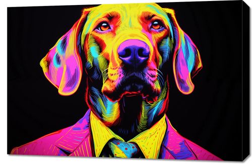 Obraz z serii pop art zatytułowany Barwna Osobowość. Ten dynamiczny portret przedstawia psa w stylu neonowym pop-artu, ubranego w elegancki garnitur z kolorowym krawatem. Intensywne, żywe barwy na czarnym tle wydobywają głębię spojrzenia i dostojność postawy psa, co nadaje temu dziełu sztuki wyjątkowy charakter. Wzór i paleta kolorów sprawiają, że obraz ten jest idealny dla współczesnych przestrzeni biurowych, designerskich mieszkań oraz galerii sztuki, które pragną dodać swojemu wnętrzu odrobinę odwagi i wyrazistości.