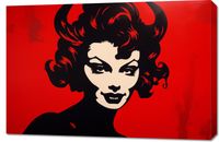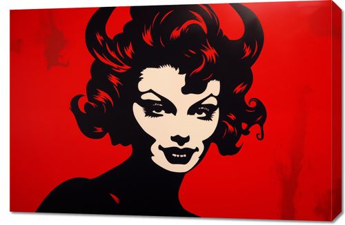 Obraz z serii pop art zatytułowany zatytułowany Czerwona Diablica. Na obrazie dominuje stylizowany portret kobiety w kontrastowych kolorach – głęboka czerń i intensywna czerwień tworzą silny wizualny kontrast, który przyciąga wzrok i intryguje. Wizerunek jest wyrazisty i graficzny, z mocnymi liniami i zredukowanym detalem, co nadaje mu nowoczesnego, prawie komiksowego charakteru. Kobieta jest przedstawiona z subtelnym uśmiechem i zmysłowym spojrzeniem, co nadaje jej tajemniczy i prowokujący charakter. Tło w jednolitym, żywym czerwonym kolorze podkreśla silną obecność postaci i jej niezaprzeczalny wpływ na otoczenie. Ten obraz jest hołdem dla klasycznej piękności i siły kobiecego wyrazu, idealnym dla przestrzeni, które pragną dodać odważnego stylu i charakteru.