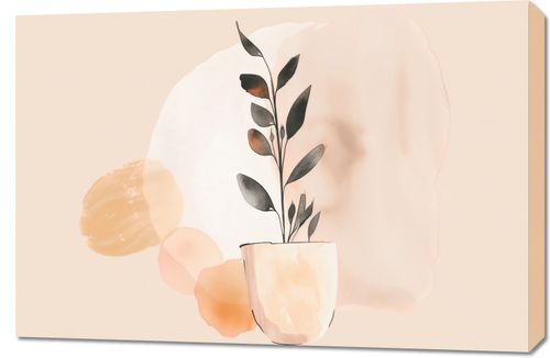 Obraz z serii wnętrza zatytułowany Doniczkowy Kolor. Obraz przedstawia minimalistyczną i stylową kompozycję roślinną na delikatnym, pastelowym tle. Centralnym punktem jest elegancka, czarno-brązowa gałązka z liśćmi w stonowanej kolorystyce, umieszczona w jasnym, beżowym doniczce o subtelnych odcieniach i delikatnym cieniowaniu. Tło składa się z miękkich, organicznych plam w odcieniach kremu, beżu i ciepłego brązowego, które tworzą efekt akwarelowy. Całość jest utrzymana w spokojnej, relaksującej palecie barw, co sprawia, że obraz ten idealnie nadaje się do przestrzeni, gdzie chcemy wprowadzić element spokoju i harmonii, jak salon czy sypialnia. Delikatność i prostota wzoru podkreślają nowoczesny charakter tego dzieła, jednocześnie zachowując ponadczasową elegancję.