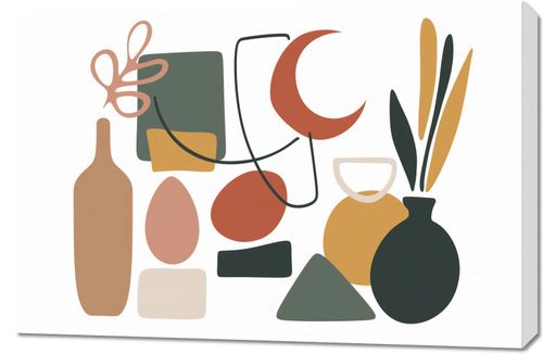 Obraz z serii minimalistyczne zatytułowany Formy Wyzwolone. Grafika składa się z zestawu prostej, ale wyrafinowanej kolekcji kształtów i form w przyjemnej, stonowanej palecie kolorów, z akcentami w odcieniach pomarańczu, zieleni, beżu i czerni. Elementy takie jak butelki, wazony i rośliny są przedstawione w sposób uproszczony, lecz stylowy, z nutą abstrakcyjnego charakteru. Obraz ten świetnie wkomponuje się w nowoczesne i artystyczne przestrzenie, takie jak designerskie biura, minimalistyczne salony, a nawet awangardowe galerie. Z jego pomocą można łatwo wprowadzić graficzną równowagę do wnętrza, zachowując przy tym lekkość i nowoczesność estetyki. Idealnie pasuje do miejsc, gdzie chce się podkreślić indywidualizm i miłość do sztuki.
