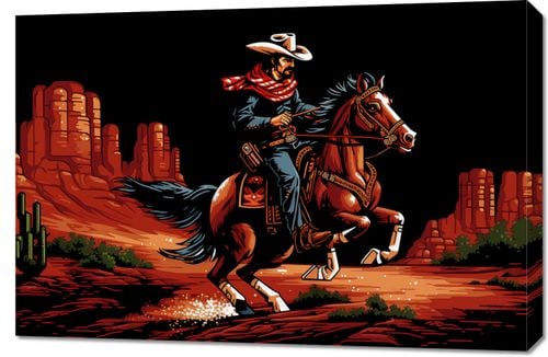 Obraz z serii pop art zatytułowany Galop przez Prerię. Dynamiczna ilustracja przedstawia kowboja w tradycyjnym stroju, galopującego na wiernym rumaku przez pustynny krajobraz. Żywe kolory i detaliczne wykonanie postaci oraz konia, a także skaliste formacje i kaktusy w tle, nadają scenie autentycznego ducha zachodniej przygody. Stylizacja graficzna łączy elementy klasycznych westernów z nowoczesną estetyką komiksu, co sprawia, że obraz ten idealnie wpisuje się w dekoracje wnętrz inspirowane amerykańskim folklorem lub jako ozdoba domowego kina dla miłośników filmów o tematyce kowbojskiej.