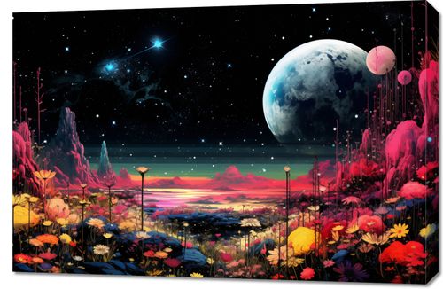 Obraz z serii pejzaże zatytułowany Inny Świat. Obraz ukazuje przepiękny, fantastyczny krajobraz, który łączy elementy kosmiczne z bujną, ziemską florą. Na pierwszym planie widzimy różnorodne, kolorowe kwiaty, które tworzą żywą, wręcz surrealną tapiserię natury. Za tym kwiatowym morzem rozciąga się widok na spokojne jezioro i majestatyczne, czerwone formacje skalne, które przywodzą na myśl marsjański krajobraz. W tle góruje olbrzymi księżyc, który dominuje na nocnym niebie pełnym gwiazd, a obok niego widnieje zarys konstelacji, dodając głębi i tajemniczości całej scenie. Obraz ten jest zaproszeniem do świata wyobraźni, gdzie natura i kosmos spotykają się w harmonii. Idealnie nadawałby się jako dekoracja do nowoczesnych przestrzeni mieszkalnych lub miejsc publicznych, które pragną wzbogacić swoje otoczenie o elementy fantastyczne i inspirujące do snucia marzeń.