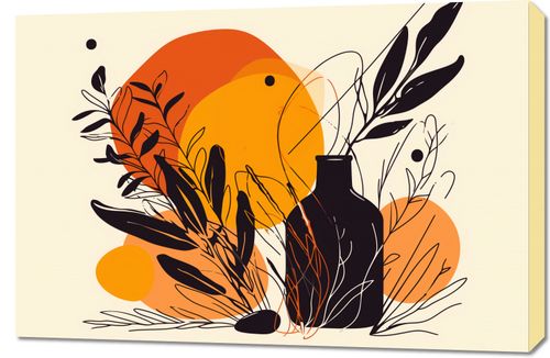 Obraz z serii minimalistyczne zatytułowany Jaskrawy Zachód. Na grafice widnieje silnie stylizowany motyw roślinny, gdzie czarne sylwetki roślin kontrastują z jaskrawo pomarańczowym i żółtym tłem, przypominającym zachodzące słońce. W tle pojawiają się delikatne, abstrakcyjne linie i kształty, dodające kompozycji głębi i tekstury.Ten plakat doskonale wpasuje się w wnętrza ożywione roślinnością, zarówno te domowe, jak i komercyjne przestrzenie typu kawiarnie lub sklepy z roślinami. Jego ciepłe barwy będą wprowadzać przytulną atmosferę i mogą stanowić żywy akcent w przestrzeniach utrzymanych w naturalnej kolorystyce.