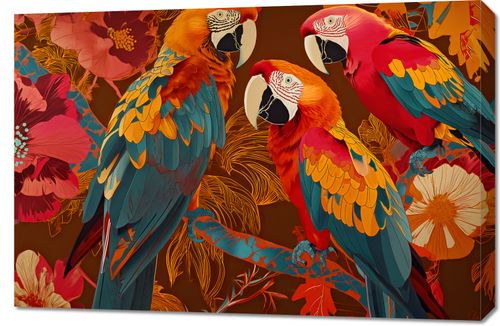 Obraz z serii abstrakcja zatytułowany Kolorowe Ary ukazuje grupę majestatycznych papug ara, których pióra w odcieniach głębokiego błękitu, gorącej pomarańczy i intensywnej czerwieni są ukazane z imponującym detalami. Ptaki są umieszczone na tle tropikalnych kwiatów i liści, tworząc barwną kompozycję, która przykuwa wzrok i przenosi obserwatora w odległe, egzotyczne krajobrazy. Dynamika i życie płynące z tego dzieła sprawiają, że jest ono idealnym wyborem dla pomieszczeń pełnych energii i pasji, takich jak kreatywne przestrzenie pracy, eklektyczne salony lub przestronne lobby hotelowe. Obraz ten celebruje różnorodność i piękno natury, przemawiając do tych, którzy cenią sobie przyrodę i kolor w swoim otoczeniu.