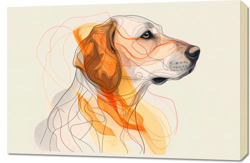 Obraz z serii abstrakcja zatytułowany Kontur Profilowego. Obraz przedstawia portret psa w stylu artystycznym, z subtelnie zaznaczonymi, ale wyraźnymi cechami. Kompozycja łączy realistyczne detale takie jak oczy, nos i uszy z abstrakcyjnymi, płynnymi liniami i plamami kolorów, które tworzą wrażenie ruchu i głębi. Dominujące kolory to odcienie pomarańczowego, żółtego i brązu, które idealnie oddają ciepło i przyjazny charakter zwierzęcia. Tło w neutralnym, pastelowym odcieniu podkreśla i równoważy bardziej dynamiczne elementy grafiki. Obraz emanuje spokojem i może wzbudzać pozytywne emocje, będąc jednocześnie wyrafinowanym, artystycznym przedstawieniem psa, który może być ulubieńcem rodziny lub po prostu przykuwającym uwagę elementem dekoracyjnym.