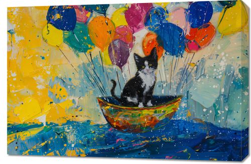 Obraz z serii abstrakcja zatytułowany Kot na Łodzi. Przedstawia on małego, czarno-białego kota siedzącego w malutkiej, kolorowej łódce, unoszącej się na żywych, błękitnych falach. Nad łódką unosi się bujny klaster jasnych, kolorowych balonów, które dodają obrazowi elementów wesołości i lekkości. Praca jest pełna energii, z widocznymi na całej powierzchni obrazu śladami energicznych pociągnięć pędzlem i plam farby, co nadaje dziełu nieco abstrakcyjny i ekspresyjny charakter. Ta mieszanka realistycznych i fantastycznych elementów tworzy ciepłą i zapadającą w pamięć scenę, która może wywoływać uśmiech i poczucie radości.