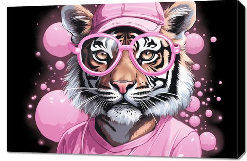 Obraz z serii pop art Ludzki Tygrys. Na obrazie widzimy głowę tygrysa, który jest ubrany w stylizowany, ludzki sposób. Tygrys ma na sobie różową czapkę z daszkiem oraz okulary w tym samym kolorze, co dodaje mu ludzkiego charakteru. Tło obrazu jest proste, pokryte bąbelkami w różnych odcieniach różu, co tworzy zabawny i lekko surrealistyczny klimat. Ten kolorowy i kreatywny projekt może przyciągnąć uwagę w różnorodnych przestrzeniach, od młodzieżowych pokoi po galerie sztuki. Jest to doskonały przykład współczesnego połączenia natury i kultury pop, który może być tematem rozmów i oryginalnym elementem dekoracyjnym.
