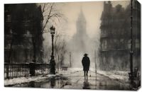 Obraz z serii wnętrza zatytułowany Mgła nad Londynem, przedstawia samotną sylwetkę przechadzającą się po mokrych, połyskujących bruku ulic, otoczoną przez klasyczne kamienice i latarnie uliczne, które rzucają cień na mglistą scenę. Szarości i sepii użyte w dziele podkreślają jego vintage charakter, a zarys wieży w tle przywołuje ikoniczny obraz Londynu. To dzieło sztuki idealnie wpasuje się w przestrzenie, gdzie chce się wywołać atmosferę tajemniczości i klasyki, takie jak biblioteki, salony w stylu retro, czy klasyczne biura prawnicze, zapewniając im wyrafinowany, metaforyczny akcent.