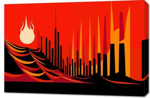 Obraz z serii abstrakcja zatytułowany Miejski Krwisty Ogień. Ta graficzna kompozycja przedstawia stylizowaną panoramę miasta z dominującymi liniami prostymi i kątami. Ciepła kolorystyka w odcieniach czerwieni i pomarańczy, wraz z jaskrawo żółtymi i czarnymi akcentami, sugeruje obraz miasta w blasku zachodzącego słońca lub w ogniu. Płomień na górze dodaje dramatyzmu, mogąc symbolizować energię i dynamikę miejskiego życia lub dosłownie - siłę i destrukcję , emanuje mocą i pasją, będąc zarazem nowoczesnym i wyrazistym dodatkiem do każdego współczesnego wnętrza, od loftów po studia artystyczne.