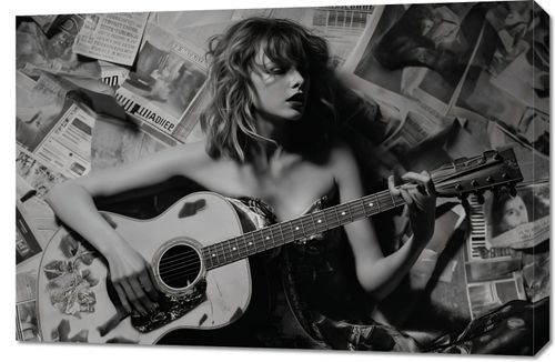 Obraz z serii pop art zatytułowany Młoda Gitarzystka. Portretuje młodą, energiczną gitarzystkę, zanurzoną w muzyce, otoczoną przez rozrzucone gazety. W monochromatycznej palecie szarości, uchwycono moment twórczego uniesienia artystki, jej pasję i pochłonięcie sztuką. W tle obrazu, strzępy artykułów i notatek muzycznych dodają głębi i kontekstu, sugerując bogatą historię i inspiracje. Obraz idealnie nadaje się do wnętrz vintage, studiów muzycznych, jak również jako inspirujący element w pokojach młodych twórców i wszędzie tam, gdzie chcemy podkreślić miłość do muzyki i jej uniwersalne przesłanie.