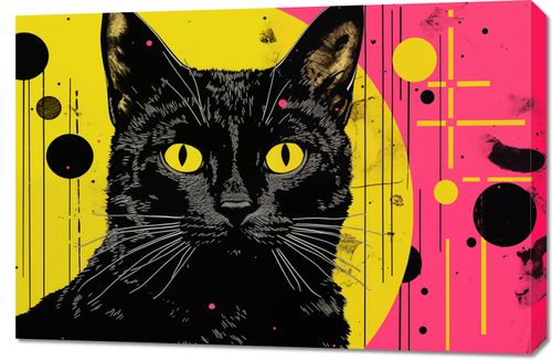 Obraz z serii pop art zatytułowany Neonowy Kocur - odważne połączenie klasycznego portretu kota z awangardowymi elementami graficznymi. Czarny kontur kota na intensywnym żółtym i różowym tle przyciąga wzrok i wzbudza zainteresowanie. Żółte oczy kota są jak punkty skupienia, które przykuwają uwagę i dodają charakteru dziełu. Abstrakcyjne formy i plamy koloru w tle wprowadzają dynamiczność i nowoczesny charakter, idealnie pasując do współczesnych przestrzeni mieszkalnych i komercyjnych. Ten obraz będzie doskonałym wyborem dla miłośników sztuki, którzy pragną dodać odrobinę kreatywności i koloru do swojego wnętrza.