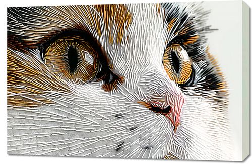 Obraz z serii abstrakcja zatytułowany Niktowany Kot. Ukazuje zbliżenie na twarz kota, wykonane z niezwykłą dbałością o detale, co sprawia wrażenie trójwymiarowości. Całość jest utrzymana w technice przypominającej szycie lub haft, gdzie każda nitka została precyzyjnie ułożona, aby naśladować naturalne linie futra. Olśniewające, złote oczy kota są pełne wyrazu i życia, przyciągają uwagę i są centralnym punktem kompozycji. Złożone z wielu warstw i kolorów linie tworzą dynamiczną i niemal hipnotyzującą teksturę. Obraz ten byłby doskonałym wyborem dla miłośników sztuki i zwierząt, wnosząc element elegancji i oryginalności do każdego wnętrza.