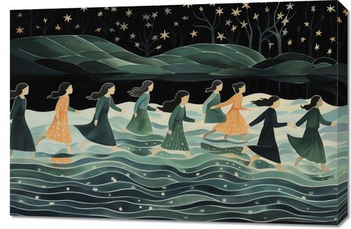 Obraz z serii wnętrza zatytułowany Nocna Procesja, przedstawia sylwetki kobiet, idących w rytmicznym ruchu przez wody, pod tajemniczym, gwiaździstym niebem. Styl obrazu, z płynnymi liniami i miękkimi pastelowymi kolorami, tworzy uczucie spokoju i onirycznej atmosfery. Postacie są przedstawione w ruchu, z włosami rozwianymi przez nocny wiatr, co dodaje dziełu poczucia tajemnicy i ruchu. Ten obraz idealnie nadaje się do wnętrz, które chcą wyrazić poczucie spokoju, introspekcji oraz kobiecej siły i solidarności, takich jak prywatne biblioteki, pokoje medytacyjne, a także przestrzenie publiczne, które pragną inspirować swoich gości do głębszego zastanowienia się nad otaczającym ich światem.