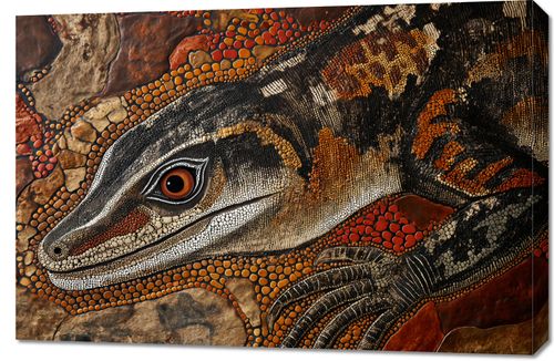Obraz z serii abstrakcja zatytułowany Oko Jaszczurki. Fascynujące dzieło sztuki przedstawia zbliżenie na oko jaszczurki, które jest wykonane z niezwykłą dbałością o detale. Bogata faktura skóry zwierzęcia oraz użycie techniki przypominającej pointylizm sprawiają, że obraz zyskuje trójwymiarową głębię i realizm. Dynamiczna paleta barw, od głębokich odcieni brązu po złote i pomarańczowe akcenty, podkreśla dziką i pierwotną esencję natury. Obraz ten idealnie wpasuje się w dekoracje wnętrz o tematyce przyrodniczej, jak również stanowić może wyrazisty element w przestrzeniach edukacyjnych, takich jak sale biologiczne czy przyrodnicze, a także jako elegancki akcent w przestrzeniach mieszkalnych dla miłośników natury i dzikiej fauny.