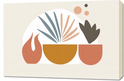 Obraz z serii boho zatytułowany Paleta Roślinna.Ten obraz łączy geometryczną prostotę z motywami roślinnymi, tworząc czystą i nowoczesną interpretację natury. Stonowana kolorystyka z akcentami pastelowych barw wprawia w stan relaksu i spokoju. Motywy roślinne, stylizowane na abstrakcyjne kształty, wyłaniają się z prostokątnych doniczek, tworząc harmonijną całość. Jest to idealny wybór dla tych, którzy cenią sobie spokój i przytulność w swoim domowym zaciszu. Obraz będzie pasował do przestrzeni życiowej urządzonej w duchu skandynawskim lub minimalistycznym, gdzie prostota formy idzie w parze z naturalnym pięknem. Może ozdobić ściany w salonach, sypialniach lub biurach, gdzie wprowadzi odrobinę naturalnej estetyki bez przytłaczania przestrzeni.