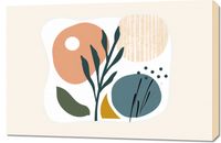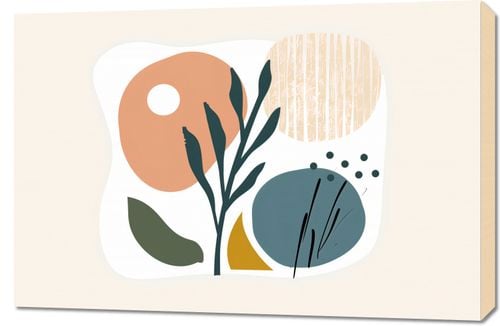 Obraz z serii boho zatytułowany Pastel Owoców.Obraz przedstawia stilizowany obraz natury, gdzie organiczne formy i kształty łączą się w nieoczywisty sposób. W kompozycji dominuje duża, pastelowa forma przypominająca owoce lub słońce, która kontrastuje z subtelnym tłem w delikatnych odcieniach beżu ozdobionym wertykalnymi liniami. Obok widnieją płynne, ciemnozielone liście oraz zaokrąglone, geometryczne formy w odcieniach szarości i musztardy, uzupełnione o subtelne graficzne akcenty. Obraz będzie pięknie komponował się w przestrzeniach poszukujących elementów natury w abstrakcyjnej, uproszczonej formie, idealnie nadając się do nowoczesnych salonów, kreatywnych przestrzeni pracy lub jako delikatny akcent w minimalistycznej sypialni.