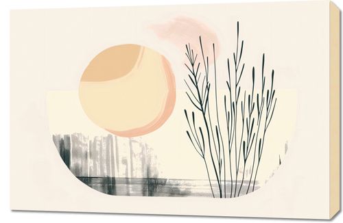 Obraz z serii boho zatytułowany Pastelowy Wschód. Obraz ukazuje subtelny, linearny rysunek roślinności na tle dużego, pastelowego słońca i delikatnie zaznaczonych elementów krajobrazu. Kompozycja w pastelowych, ciepłych barwach tworzy wrażenie spokojnego wschodu słońca, który rozświetla delikatne kontury roślin i miękkie formy w tle. Obraz ten idealnie wpasuje się do wnętrz o stonowanej kolorystyce, gdzie może dodać odrobinę ciepła i subtelnego charakteru. Doskonale nadaje się do sypialni, salonów, czy innych miejsc odpoczynku, gdzie wprowadzi łagodny nastrój i poczucie wyciszenia.