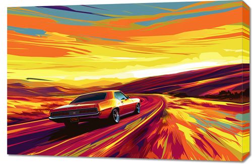 Obraz z serii abstrakcja zatytułowany Pędź Przed Siebie. Prezentuje klasyczny samochód w stylu muscle car, przemierzający pejzaż w kolorach zachodzącego słońca. Dynamiczne linie i żywe barwy od żółci, przez pomarańcz, aż po głębokie czerwienie tworzą wrażenie szybkości i wolności. Sylwetka samochodu, wyraźnie odznaczająca się na tle rozmytych kolorów, podkreśla moc i energię jazdy. Ten obraz idealnie wpasuje się w przestrzenie pełne dynamiki i pasji, takie jak garaże, salony gier, prywatne kina domowe lub nowoczesne salony. Doda on charakteru wnętrzu, inspirując do aktywności i cieszenia się każdą chwilą.