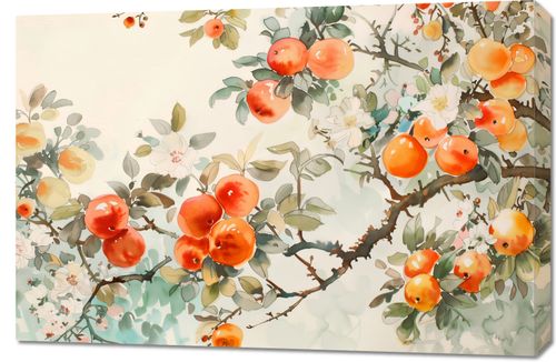 Obraz z serii abstrakcja zatytułowany Persymony. Przedstawia delikatną i kolorową ilustrację gałęzi owocowych w stylu azjatyckiej akwareli. Na obrazie widzimy rozkwitające kwiaty oraz dojrzałe, soczyste owoce persymony których intensywna pomarańczowa barwa jest pięknie wyeksponowana na tle pastelowych kolorów. Liście i gałęzie są przedstawione z subtelnymi niuansami zieleni i brązów, co dodaje głębi i naturalnego charakteru scenie. Ta sztuka łączy w sobie tradycyjne motywy i techniki malarskie z nowoczesnym podejściem do koloru i kompozycji, co czyni ją zarówno klasyczną, jak i współczesną. Obraz ten idealnie nadawałby się do przestrzeni, które cenią spokój i harmonię, takich jak salony relaksacyjne, gabinety spa, czy jako wyrafinowany akcent w domowej jadalni.