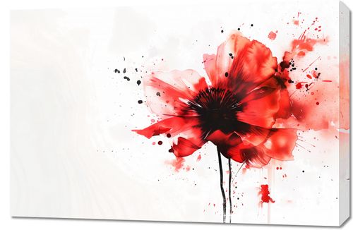 Obraz z serii abstrakcja zatytułowany Płynna Akwarela. Na obrazie przedstawiony jest kwiat w stylu akwarelowym, z dominującą czerwoną paletą barw, która przechodzi w mocne akcenty czerni w centrum kwiatu. Obraz ma dynamiczny i spontaniczny charakter, co podkreślają rozbryzgi i krople farby rozchodzące się wokół kwiatu. Przypomina to efekt plamy, który dodaje kompozycji artystycznego wyrazu i energii. Kontrast między delikatnymi czerwieniami a głęboką czerń centrum kwiatu przyciąga wzrok i czyni obraz bardzo wyrazistym. Tło jest jasne z subtelnie zaznaczonymi plamami, co dodatkowo akcentuje dramatyzm i piękno przedstawionego kwiatu.